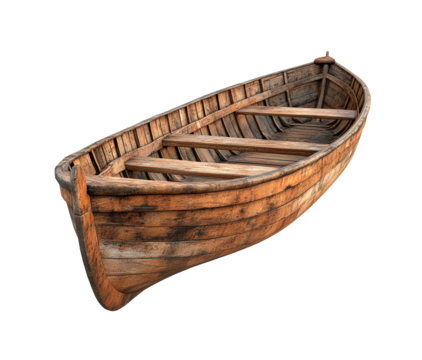 A rustic fishing boat moored in a tranquil harbor with scenic coastal views isolated on white background