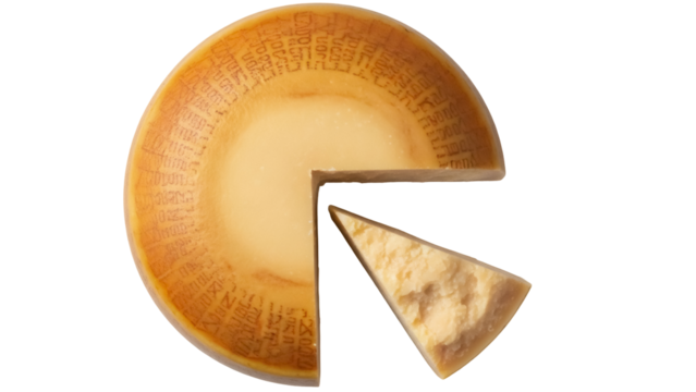 Isolated Parmigiano Reggiano cheese wheel portion, cut wedges, authentic Italian hard cheese