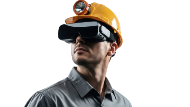An industrial engineer wearing a hard hat and safety vest interacts with a virtual reality headset for a futuristic construction simulation.