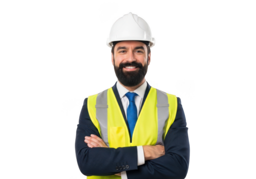 Smiling construction worker wearing hard hat and safety vest, isolated on transparent background