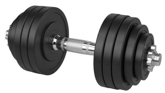 A black adjustable dumbbell with multiple weight plates and a textured metal handle for grip.