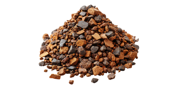 Broken pieces of cement and rocks on a pile of dirt. Isolated white background.
