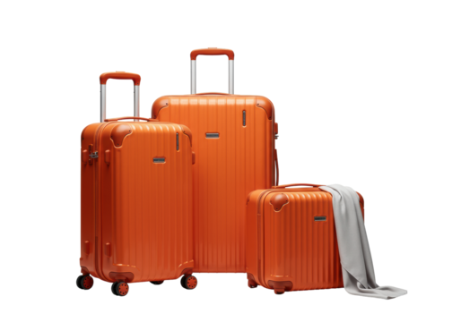 Two orange hardshell suitcases and light grey silk scarf on seamless light grey studio background with high-key lighting, clean product display concept