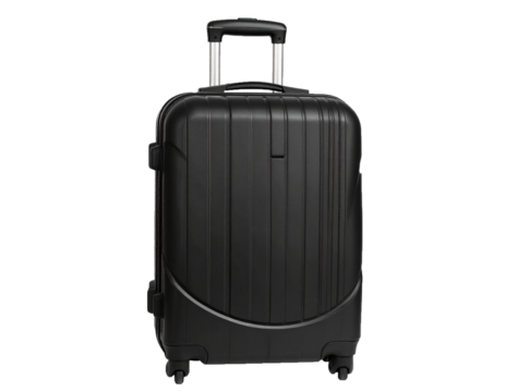 Isolated suitcase on transparent background — high-resolution PNG cutout of hard-shell carry-on travel luggage with telescopic handle and wheels, clean edges, minimal studio lighting