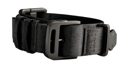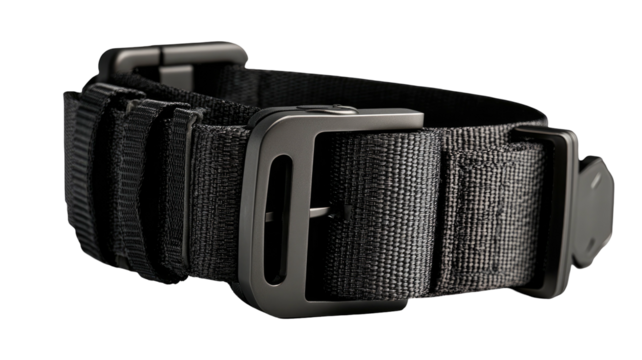 Dark textured nylon strap with a squared gunmetal buckle and multiple loops