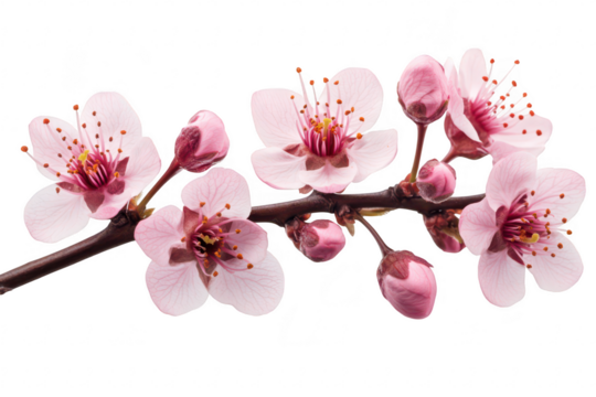 A close-up view of delicate pink cherry blossom flowers and buds on a branch. their intricate details against a clean white background. ideal for nature-themed designs or seasonal promotions