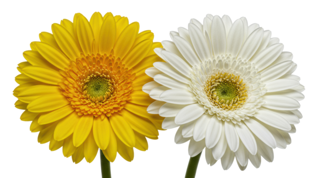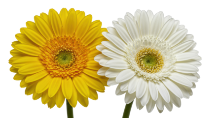 Two pristine yellow and white gerbera daisies, intricate petals, vibrant centers, macro shot on immaculate white studio background with soft diffused light, natural purity and simplicity concept