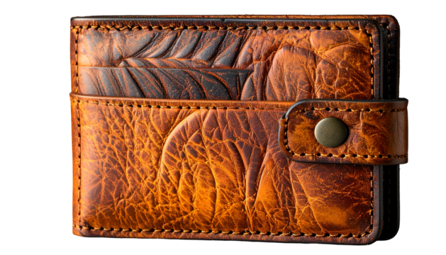 Close-up of a textured, brown, leather wallet with a metal snap closure. The surface has an embossed design