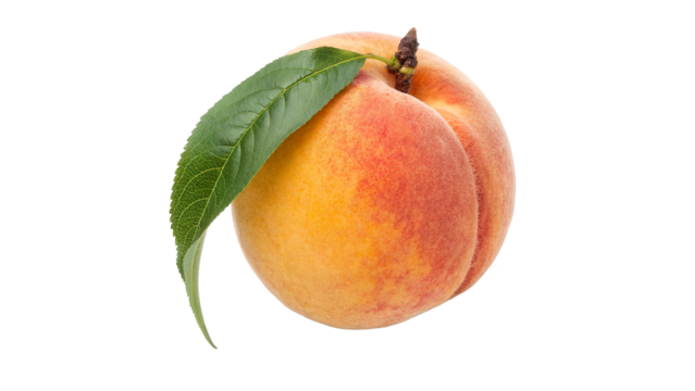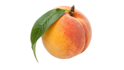 Fresh peach with green leaf has a smooth surface with shades of orange and yellow isolated on transparent background cut out
