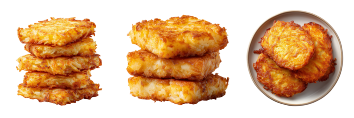 Stacked golden brown hash browns and hash brown patties on a plate isolated on a transparent background