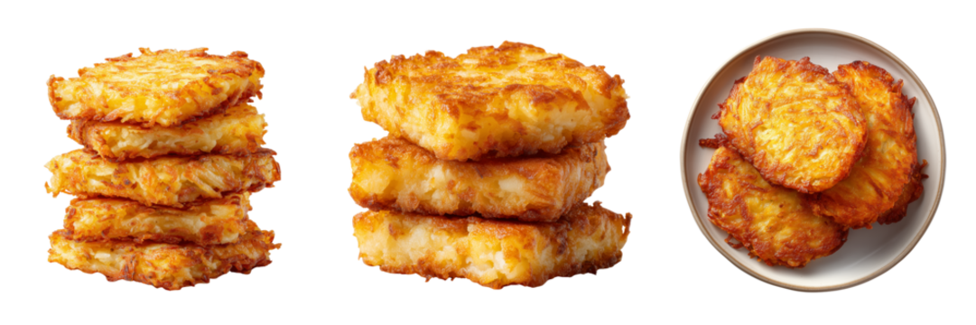 Crispy golden hash browns on transparent background studio shot for food photography