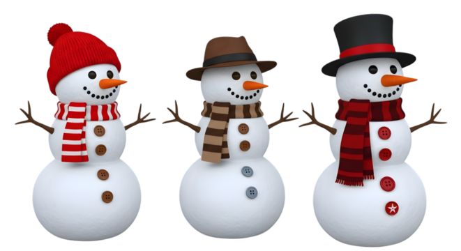 Three cheerful snowmen wearing hats and scarves, isolated on transparent background