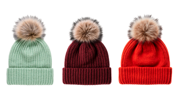 knitted cap and scarf a series of multi-colored knitted hats with a fluffy pompom