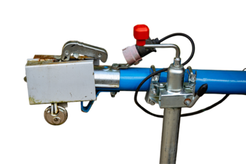 Blue logging truck hauling stacked timber with vertical posts, isolated on a transparent background