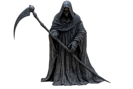 PNG A haunting and detailed statue of the Grim Reaper, symbolizing death and the passage of time, perfect for spooky themes.