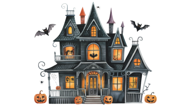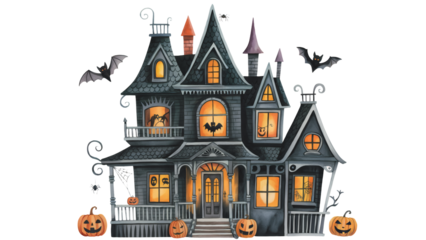 Spooky haunted house with bats and pumpkins, perfect for Halloween invitations and festive designs                  transparent PNG, isolated background