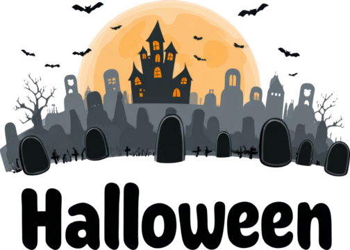 A festive happy halloween banner features a spooky pumpkin, haunted house, crosses, bats, and a black cat on a transparent background