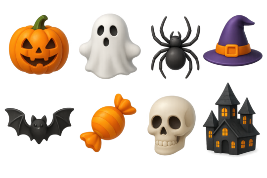 Halloween icons: pumpkin, ghost, spider, witch hat, bat, candy, skull, haunted house