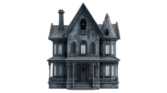 Spooky victorian haunted mansion with gnarled tree isolated on transparent background