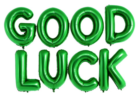 two rows of green metallic balloons spelling "GOOD LUCK" in uppercase letters. The balloons are shiny, reflective, and have a dark blue outline.