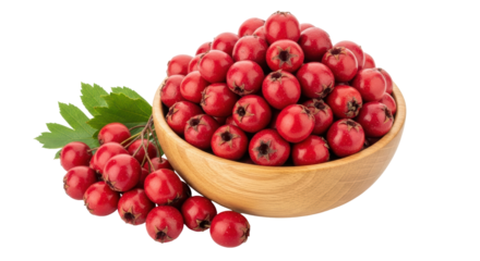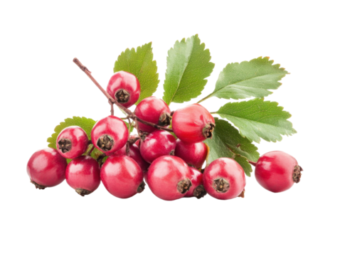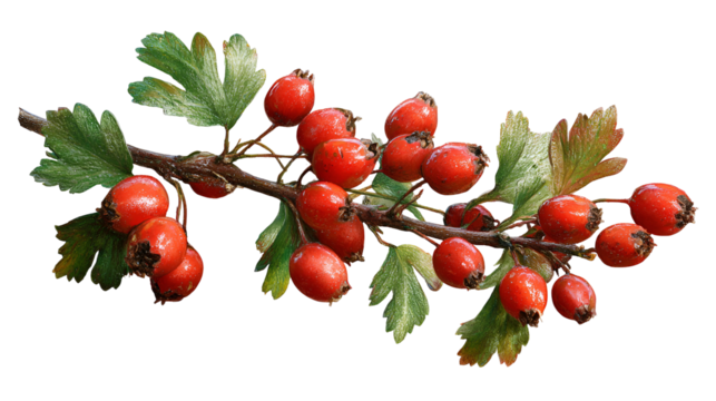luscious cluster of red hawthorn berries on a branch with green leaves, evoking autumn's bounty, natural beauty, and the charm of the countryside