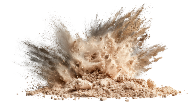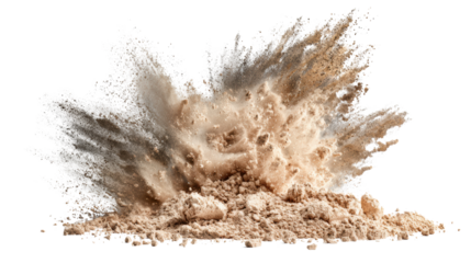 Dust explosion with natural particles, dramatic motion against a black background.