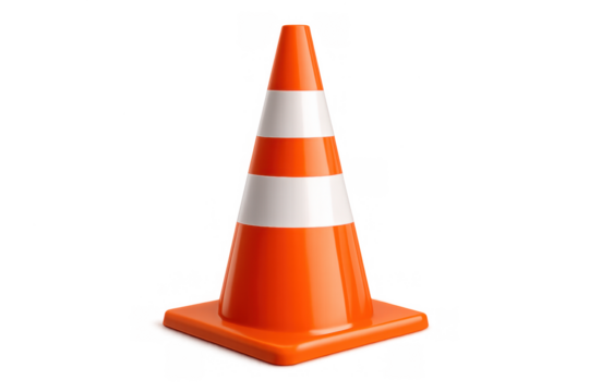 Orange traffic cone with white reflective stripes standing, representing road work, construction site safety, and caution