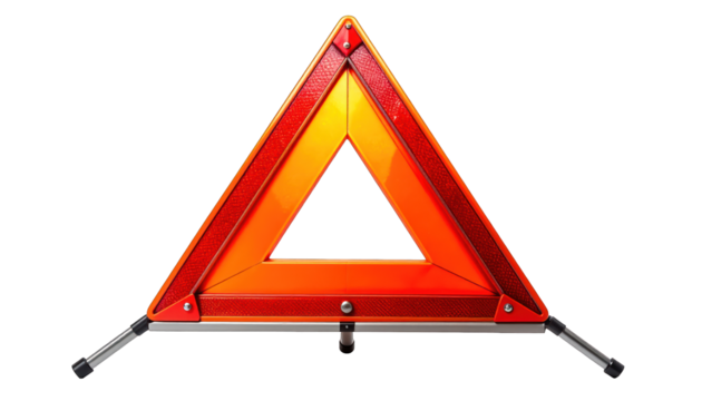 A bright orange, triangular hazard warning device against a stark black backdrop