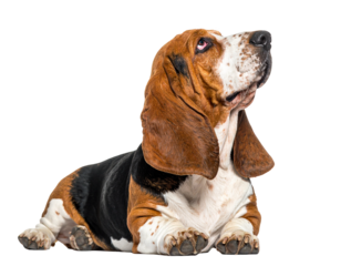 A Basset Hound dog lying down and looking up with its long ears hanging down.