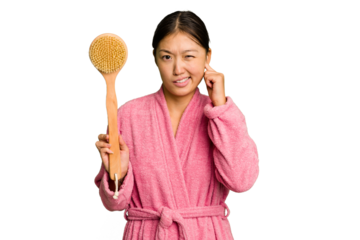 Young asian woman holding a shower brush isolated covering ears with hands.