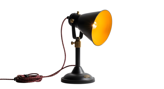 Black metal desk lamp with adjustable head isolated on transparent background