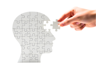 Colorful puzzle pieces depict a human head silhouette isolated on transparent background