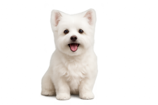 Transparent PNG cheerful small white fluffy dog smiling and looking at camera clean cutout
