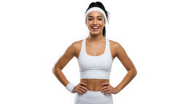 Smiling female athlete in athletic gear with badminton racket against transparent background