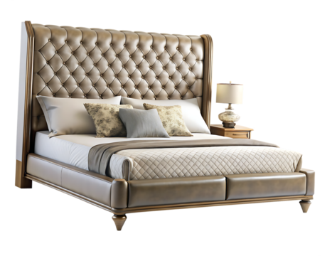 Tall tufted leather bed with winged headboard and bedside lamp bedroom furniture isolated on a transparent background