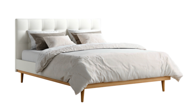 Elegant modern bed with a tufted headboard and plush bedding. set against a clean white background. ideal for interior design inspiration or home decor showcasing