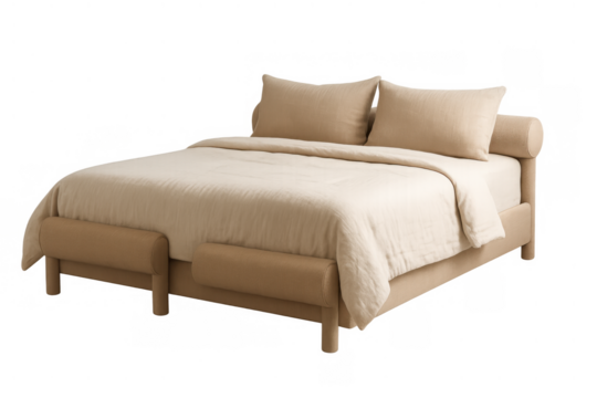 Comfortable king size bed with beige bedding, pillows, duvet, and mattress on a transparent background