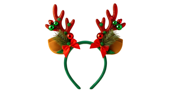 Festive red antler headband with green ornaments and bells for christmas holiday celebrations
