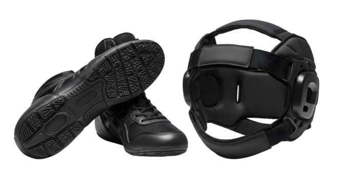 SPORT - Black wrestling shoes and protective headgear isolated on white, perfect for wrestling training and sports competitions