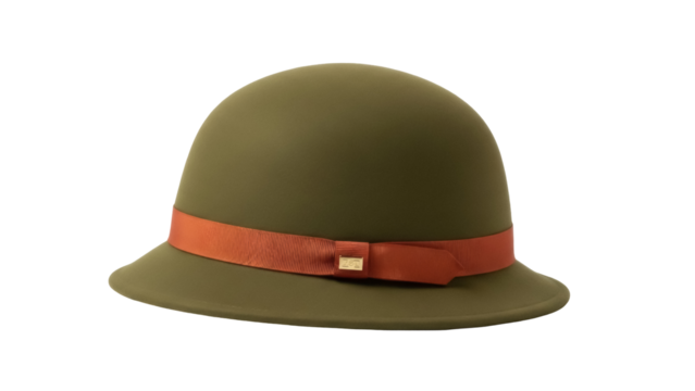 Stylish olive green cloche hat with orange ribbon isolated PNG, vintage fashion headwear on transparent background for apparel design