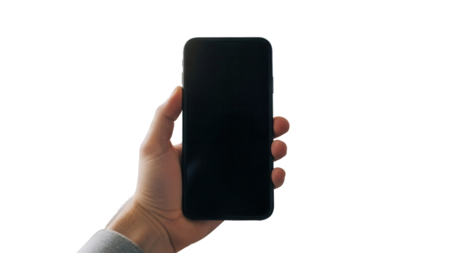 Hand presenting a blank smartphone screen in a modern home office with a dog bed  Isolated on Transparent Background