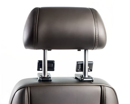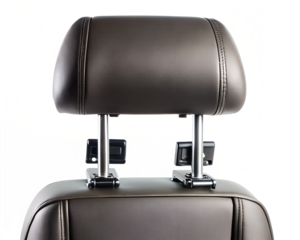 Dark brown leather car headrest with metal supports isolated on transparent background