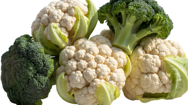 Fresh broccoli and cauliflower heads displayed together in a healthy food shot