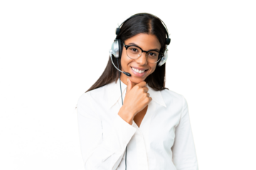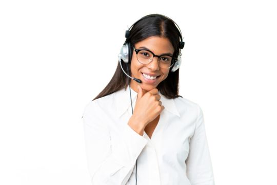 Telemarketer African American woman working with a headset over isolated chroma key background with glasses and smiling
