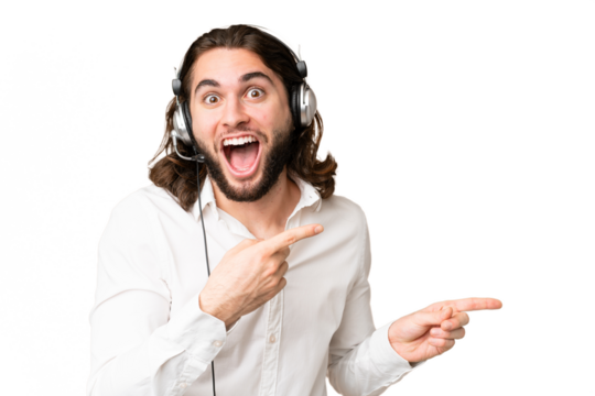 Telemarketer man working with a headset over isolated chroma key background surprised and pointing side