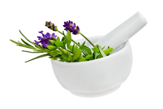 Kräuter und weisser Mörser  Hintergrund transparent PNG cut out  Mortar and Herbs