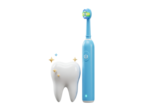 Isolated shiny tooth, next to a modern light blue electric toothbrush on display