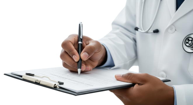 Medical clipboard with blank patient chart document and stethoscope, symbolizing healthcare, examination, and record keeping