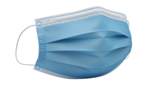 Blue disposable surgical mask with ear loops is neatly displayed, representing health protection and medical safety during a pandemic.
