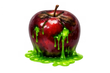 Red apple rotting with green toxic slime dripping down, representing hazard, health risk, and halloween themes. Transparent background